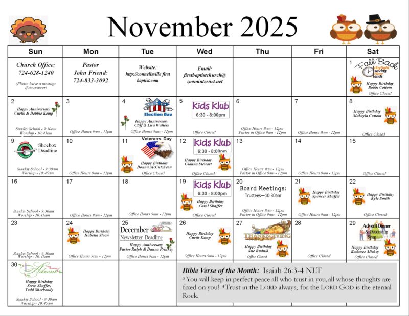 Please Stop by often for updates to our schedule. Please call the church office if you need to speak to Pastor John Friend or have business with the church secretary, 724-628-1240.